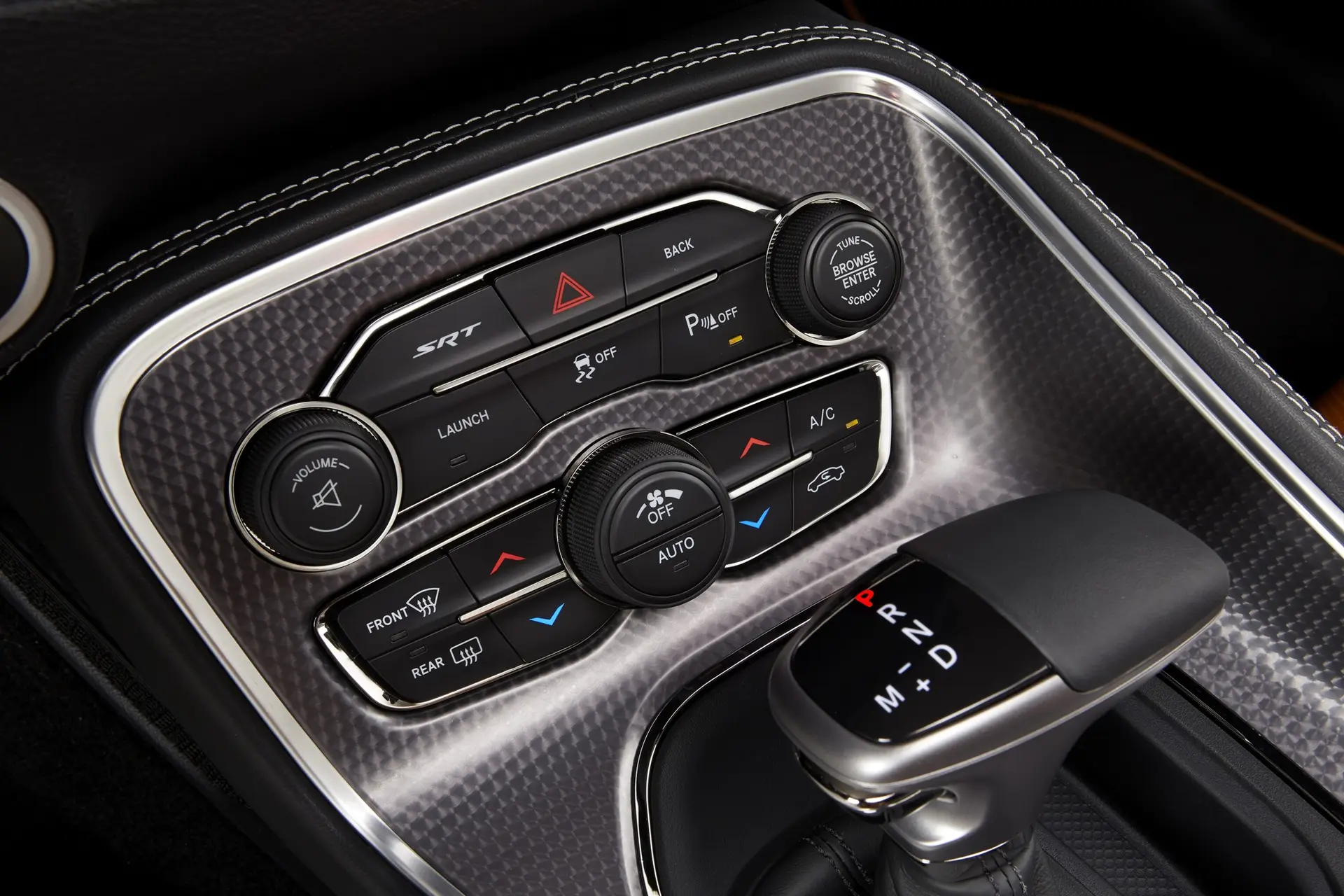 A new, trapezoidal shaped stamped aluminum center console provides Challenger SRT’s interior with a fresh look. The aluminum trim gets one of two finishes, “Hectic Mesh” for the Challenger 392 SRT and “Dark Engine Turn” for the Challenger SRT Hellcat. The console also exudes craftsmanship and style with leather-wrapped surfaces and French-seamed accent stitching running from the back to the front. Employing a unique, elevated design, the all-new center console houses ergonomically located redundant button and knob controls for audio and climate functions. An all-new media hub with an SD card slot, USB outlet and audio jack is neatly housed inside the center console’s flocked armrest.