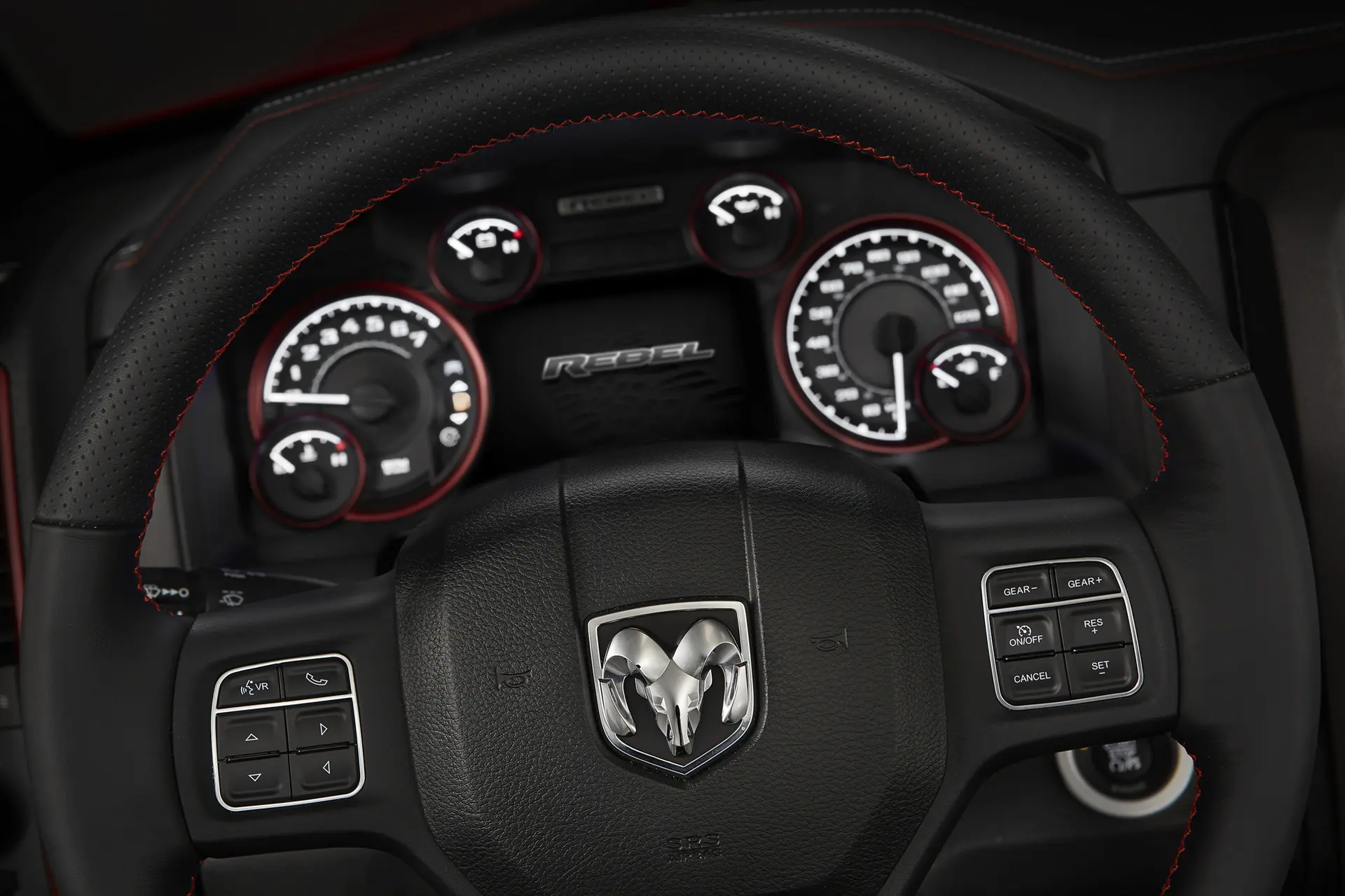 High-durability technical grain vinyl seats are finished in Radar Red and Black with Sedoso fabric inserts embossed with the Toyo tire tread pattern, matching the Rebel’s actual footprint. Standard heated front seats feature Light Diesel Gray accent stitching, Radar Red Ram’s head embroidery on the headrests and Black with Light Diesel Gray Rebel nameplate embroidered on upper seat bolsters.
