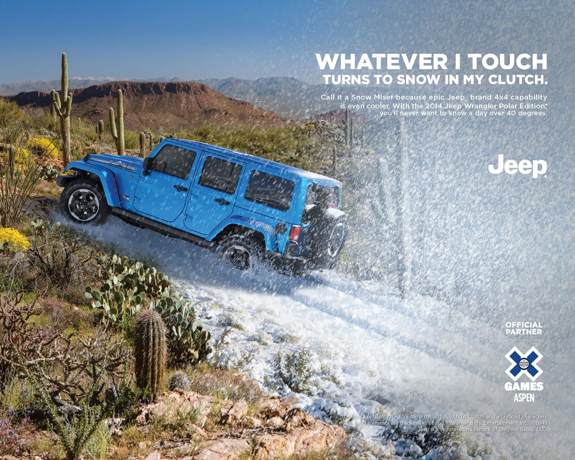 The Jeep brand’s new commercial, featuring the 2014 Jeep Wrangler Polar edition, will begin airing on Saturday, January 18, on ESPN and ESPN2 in conjunction with the X Games Aspen 2014. The new spot, “Mr. Ten Below,” incorporates the lyrics from the Warner Bros. Television’s Rankin/Bass animated holiday classic, “The Year without a Santa Claus.” The new spot showcases the 2014 Jeep Wrangler Polar Edition as it spends the day conquering a deep snow covered mountain while others stay inside with lyrics (by writers Jules Bass and Maury Laws) proclaiming: “Friends call me Snow Miser, whatever I touch. Turns to snow in my clutch.” The 2014 Jeep Wrangler Polar Edition attacks snow drifts and sends snow flying everywhere, as if it’s disintegrating the snow on contact. The spot aligns with the brand’s action sport lifestyle and captures the capability of the Jeep Wrangler, showing that given the right equipment, the potential for adventure is limitless.