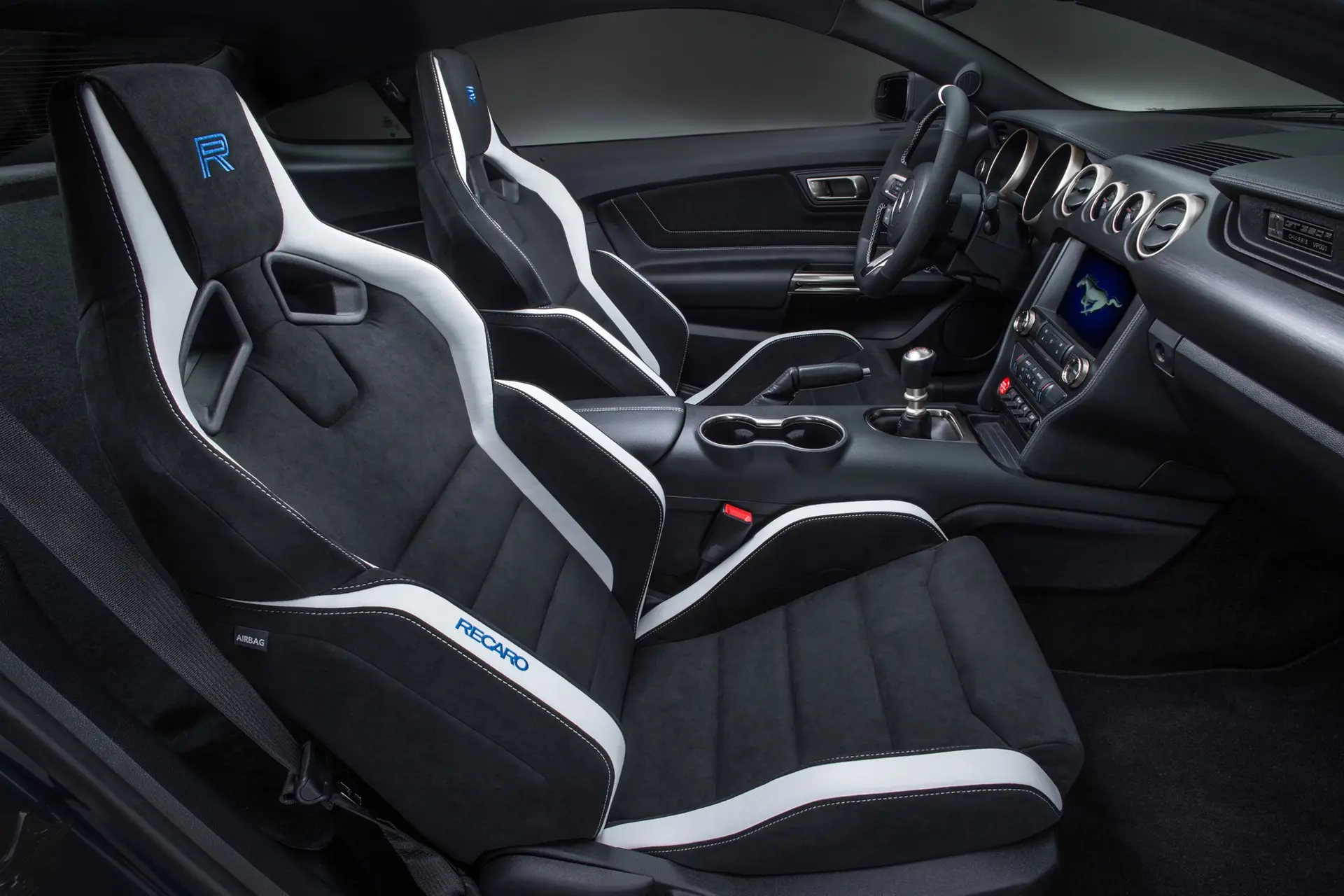 Aside from carbon fiber wheels, larger front splitter and rear wing, Shelby GT350R features distinct design details. Exterior touches include red painted brake calipers, red pin striping at the edges of the optional over-the-top racing stripes and Shelby GT350R badging. Inside is high-contrast red stitching, Shelby GT350R badging and the D-shaped steering wheel fitted with a red center mark at the top.