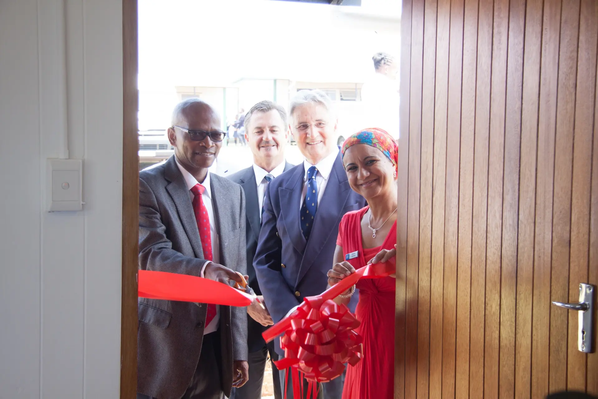 Officially opening of the two new classrooms are school principal, Selby Madlala (left) and Gishma Johnson, GMSA corporate communications manager, with Mike Hall-Jones, Key Pietermaritzburg MD and Colin Cowie, chairman of the GM Childlife Foundation.