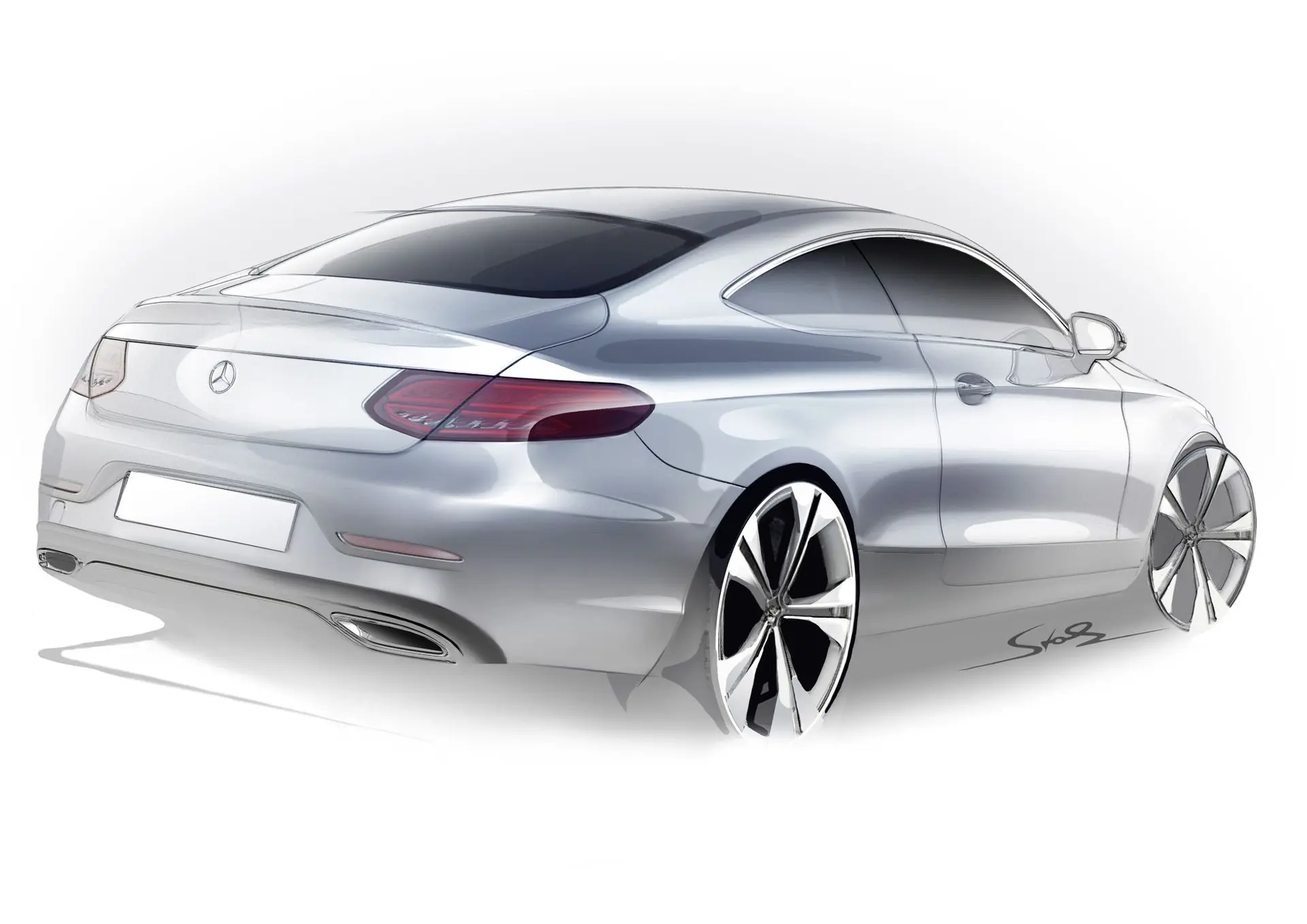 Compared with the saloon model, the C-Class Coupé has a completely newly designed rear end that carries the genes of the S-Class Coupé. A strong taper in the C-pillar forms a powerful shoulder, which is distinctly sculpted and gives the impression of a muscle. Because the number plate is located in the bumper, the designers were able to give the surfaces of the boot lid more definition. This puts the focus more strongly on the Mercedes star centrally placed on the boot lid. It hides a retractable surround view camera that is available as an option.