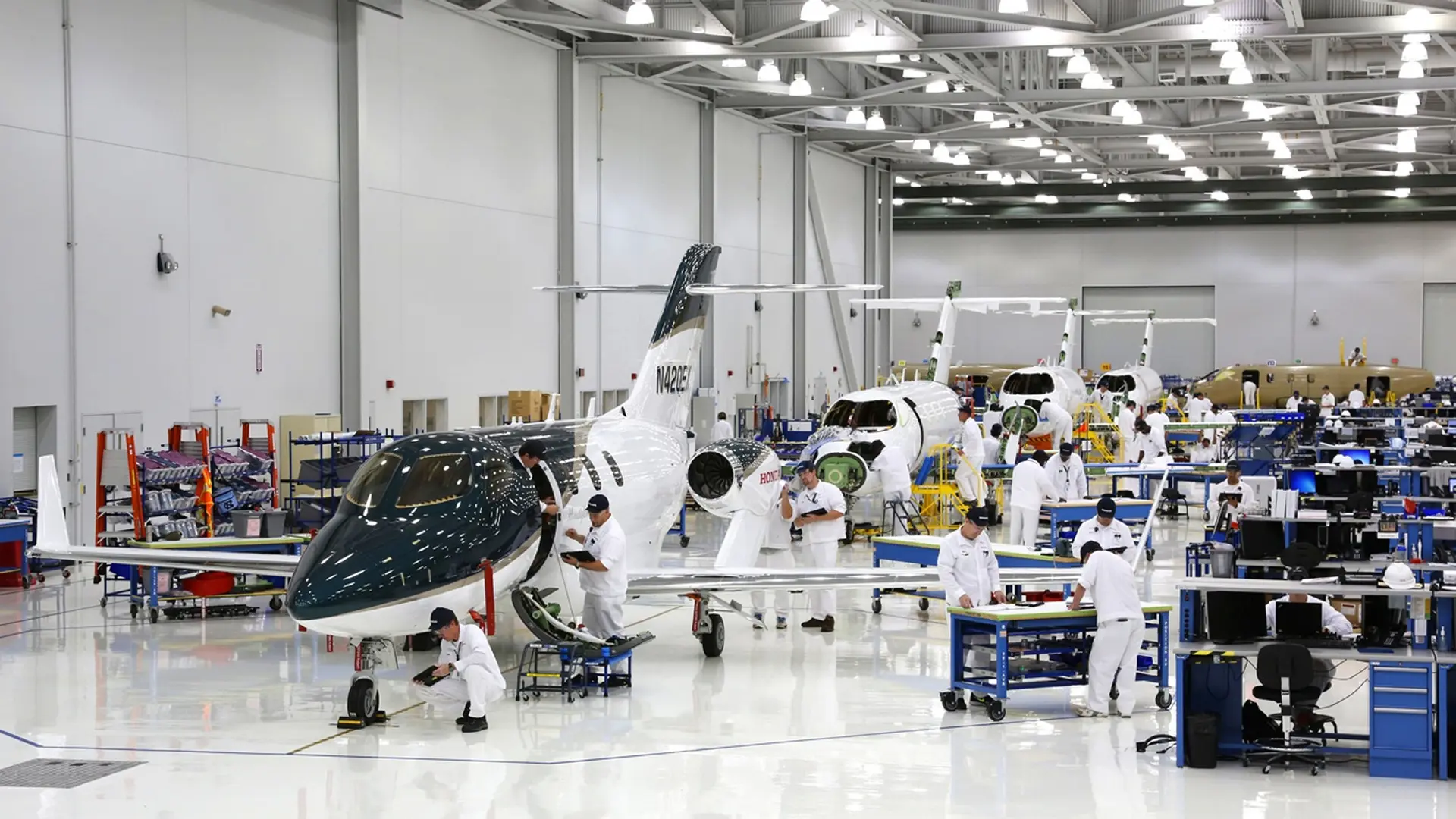 Production moves forward with nine aircrafts already on the assembly line. This steady build up supports Honda Aircraft Company’s objective to have aircraft ready for delivery immediately after type certification is achieved next year.