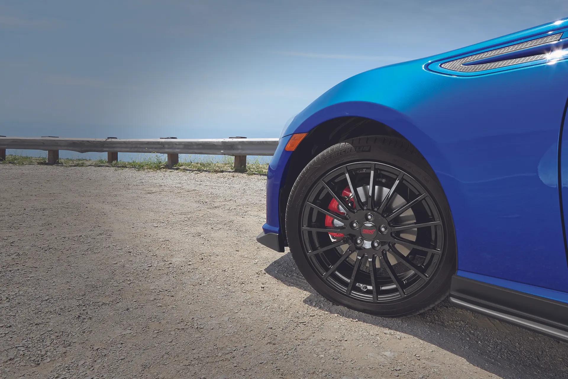 The Subaru BRZ Series.Blue boosts the car’s aerodynamic performance with black STI-branded front, side, and side-rear under spoilers, which contribute to additional front downforce, and underbody panels that, while not seen, reduce the coefficient of drag (Cd) from 0.28 to 0.27.