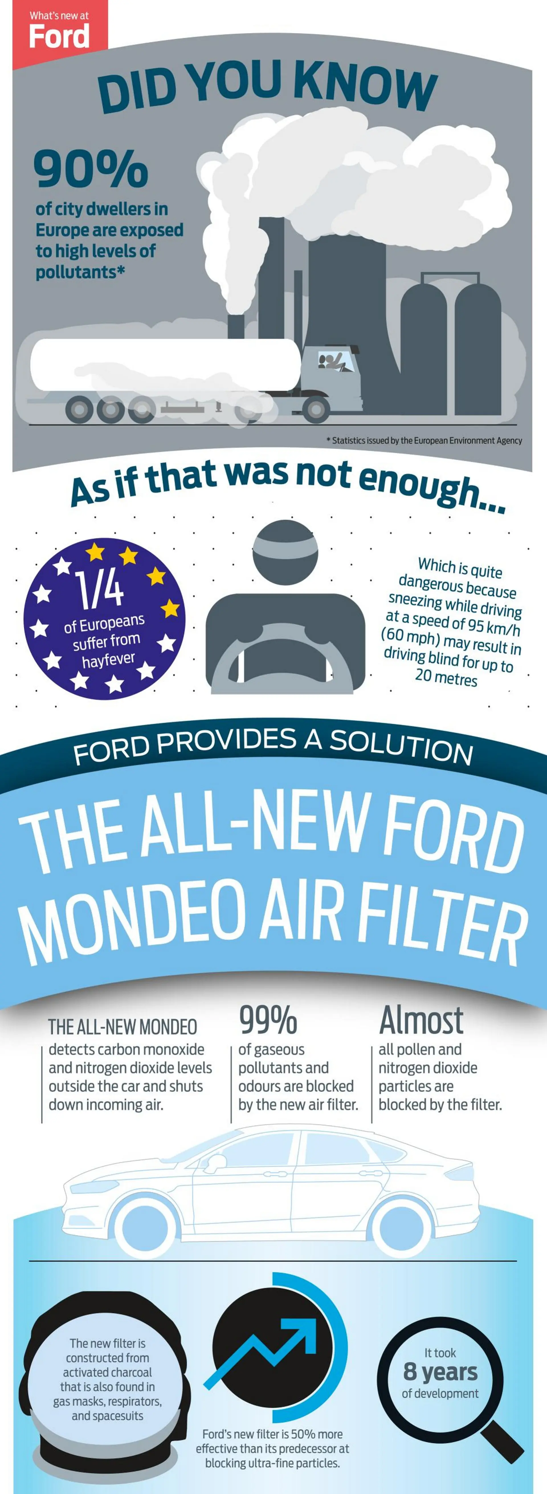 Ford is introducing a new air filtration system on the all-new Mondeo that blocks up to 99 per cent of pollen, almost all nitrogen dioxide – a key trigger of asthma – as well as gaseous pollutants and odours.