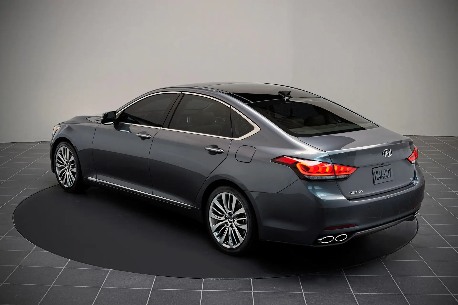 EXTERIOR DESIGN The 2015 Hyundai Genesis expresses a truly modern design through distinctive exterior styling with a sleek, upscale appearance. Evoking a premium feel, the design cues display a new Hyundai family aesthetic: simple and harmonious design with refined fluidic elements. The design features the modern Hyundai look, with a striking hexagonal front grille as a key geometric element, a dynamic crease accent running along the flanks of the car, and a dynamic rear design. Design surfaces convey a kinetic elegance, relying more on voluminous body sections than surface details to create dramatic forms. Proportions demonstrate a long dash-to-axle length, longer wheelbase and shorter overhangs than its predecessor. These proportions clearly convey the performance rear-drive configuration beneath the sheetmetal.