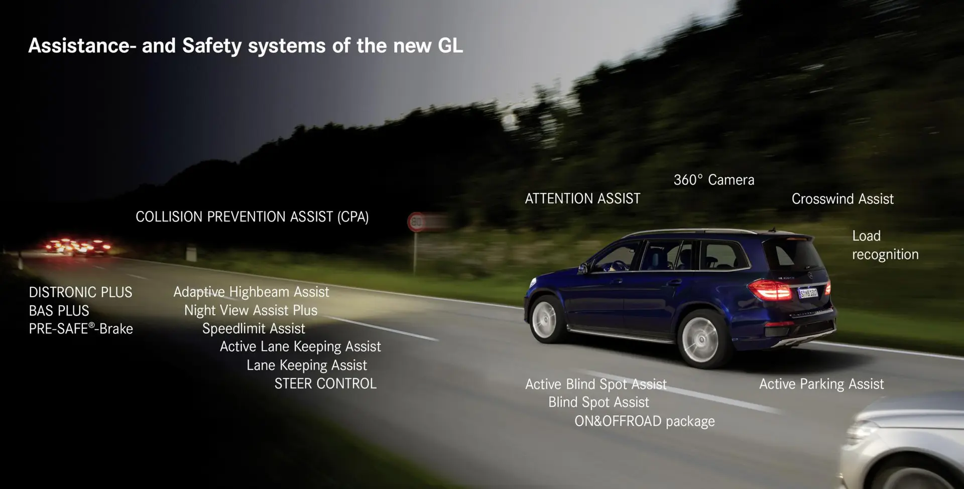 Further optimisation of driving and condition safety in the new Mercedes-Benz GL-Class is provided primarily by the numerous assistance systems’ capacity to pre-empt accidents by acting as an “electronic crumple zone”.