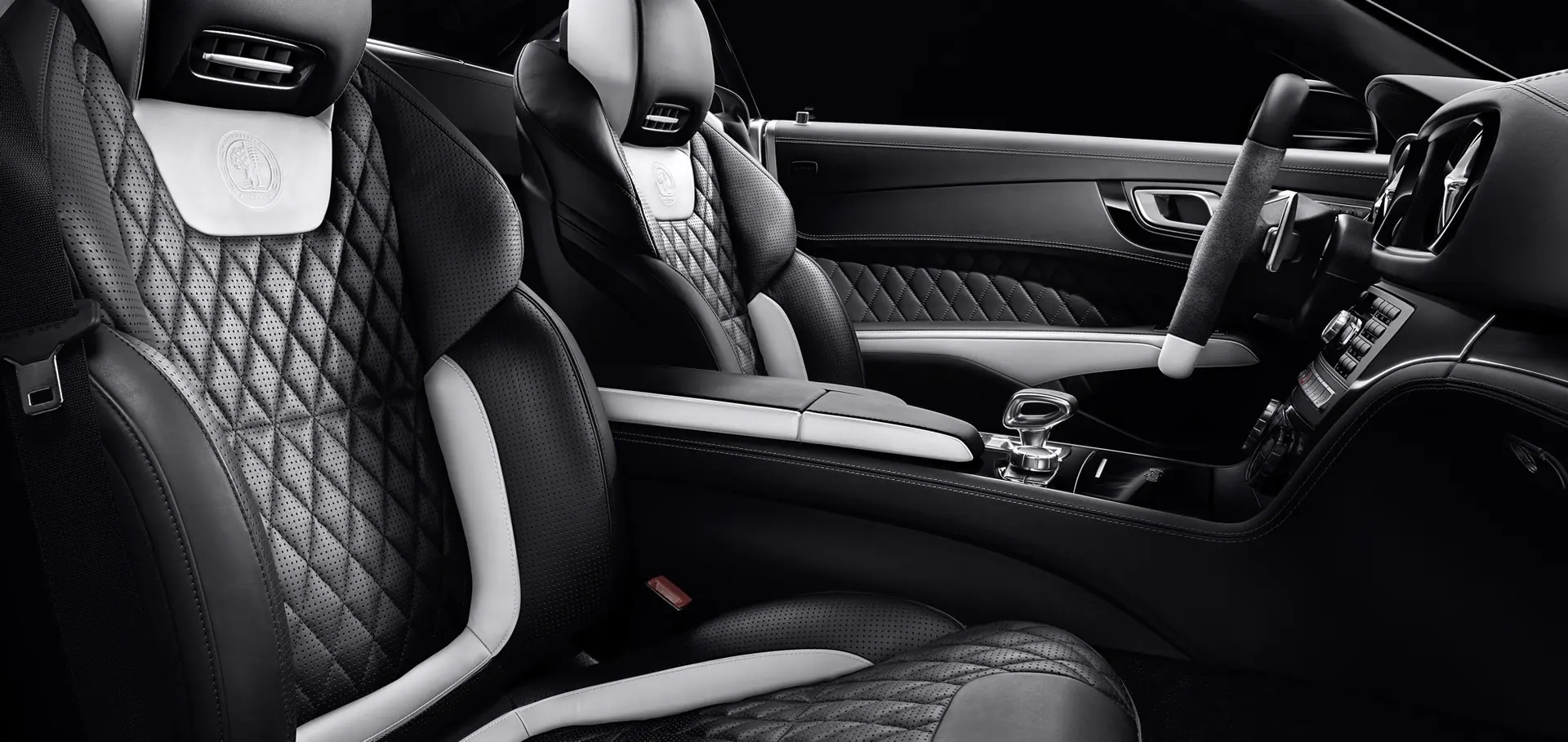 The driver and passenger sit in AMG sports seats featuring an embossed AMG emblem in the backrest, an AMG-specific diamond pattern in Exclusive nappa leather and contrasting trim in designo platinum white pearl nappa leather. The door centre panels also sport the AMG-specific diamond design; here too, the fine designo leather in platinum white pearl adorns the side sections of the armrests, the doors and the centre armrest. This exclusive look is underscored by an AMG performance steering wheel in nappa leather/Alcantara® with a bezel in high-gloss black. The steering wheel features a high-quality hand-crafted finish with white contrasting topstitching. In the lower part it bears an insert in designo platinum white pearl nappa leather plus black marking in the 12 o’clock position. The two-tone look is defined by designo trim in black piano lacquer (no-cost option: AMG carbon-fibre trim), floor mats with AMG lettering and an insert in designo platinum white pearl leather plus the surrounds of the air outlets in high-gloss black.