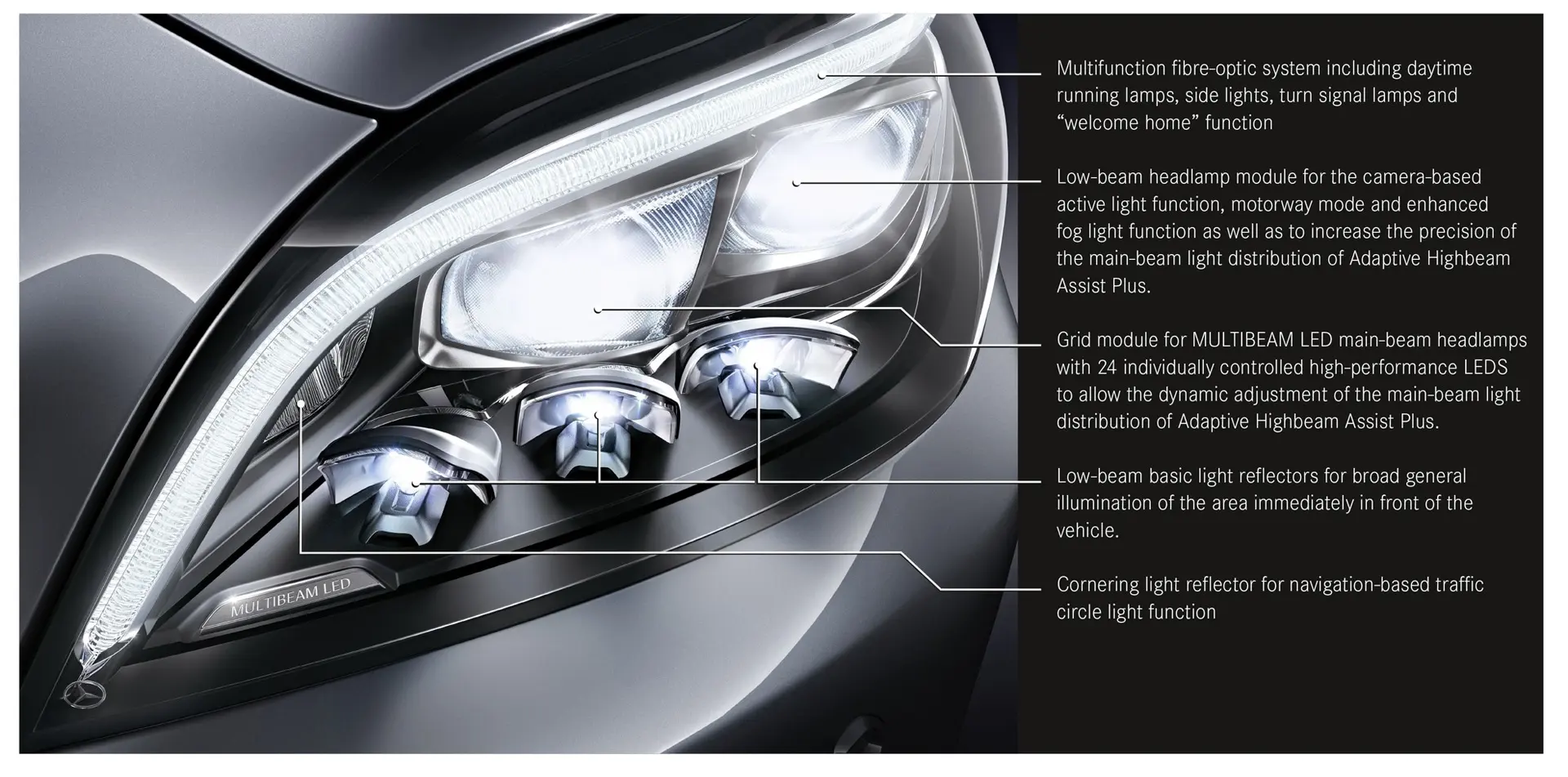 With the new MULTIBEAM LED headlamps Mercedes-Benz opens a new chapter in lighting design. They make use of the many advantages of LEDs in an innovative way and combine them with state-of-the-art lighting and control technologies. Consequently they offer the driver significantly more benefits in daily driving than all other headlamp systems. MULTIBEAM LED headlamps expand the Intelligent Light System’s previous functionality (Adaptive Highbeam Assist, country mode, motorway mode, fog lamps, active light function, cornering light function, LED daytime driving lamps) with a number of outstanding, innovative lighting features: