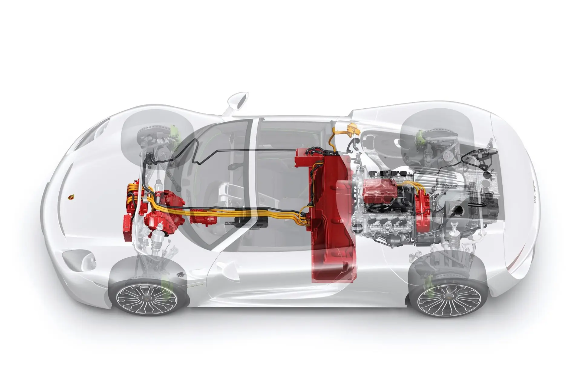 The V8 engine is coupled to the hybrid module as the 918 Spyder is designed as a parallel hybrid like Porsche’s current hybrid models. The hybrid module essentially comprises a 115 kW electric motor and a de-coupler that serves as the connection with the combustion engine. Because of its parallel hybrid configuration, the 918 Spyder can be powered at the rear axle either individually by the combustion engine or the electric motor, or via both drives together. As is typical for a Porsche super sports car, the power unit assembly in the 918 Spyder has been placed in front of the rear axle, and it does not have a direct mechanical connection to the front axle. A seven-speed Porsche Doppelkupplung (PDK) transmission handles power transmission to the rear axle.