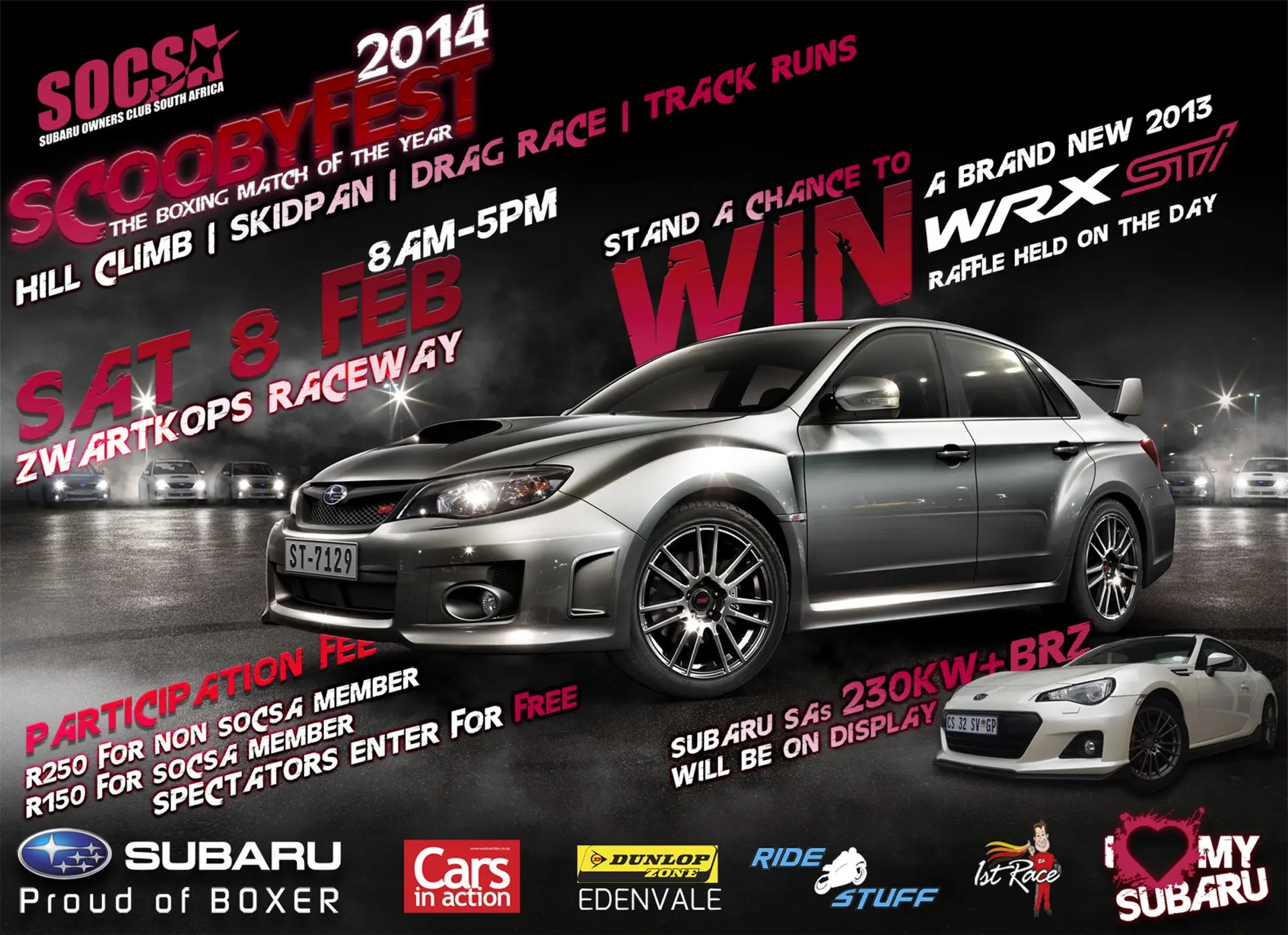 Zwartkops Raceway near Pretoria is set to be enveloped by the thrum of Subaru Boxer® engines as the Subaru Owners Club of South Africa (SOCSA) descends on the track for Scoobyfest 2014, on 8 February. The Club’s annual performance get-together, the 2014 edition of Scoobyfest promises to be the biggest and best yet, with overwhelming support coming from all directions.