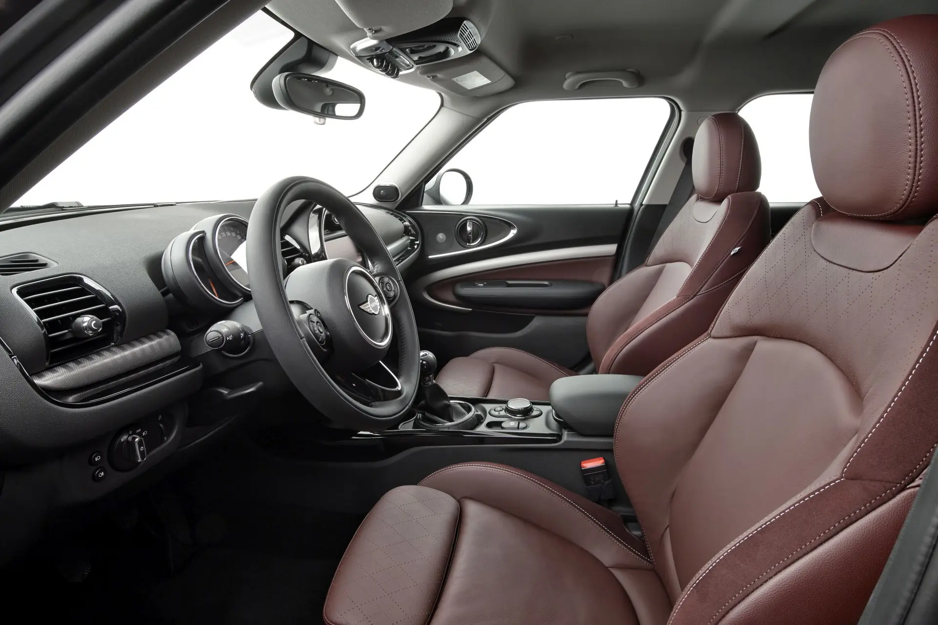 • Entirely newly designed interior; broad instrument panel with cockpit facia frame in upper section; instrument cluster on the steering column; harmoniously integrated circular central instrument with LED lighting ring and display for vehicle, infotainment, phone and navigation functions; air conditioning control unit and toggle switch below the central instrument; centre console with electric parking brake, storage compartments, two cup holders, MINI Controller and armrest; high-end decorative strips for centre console and door trim panels.