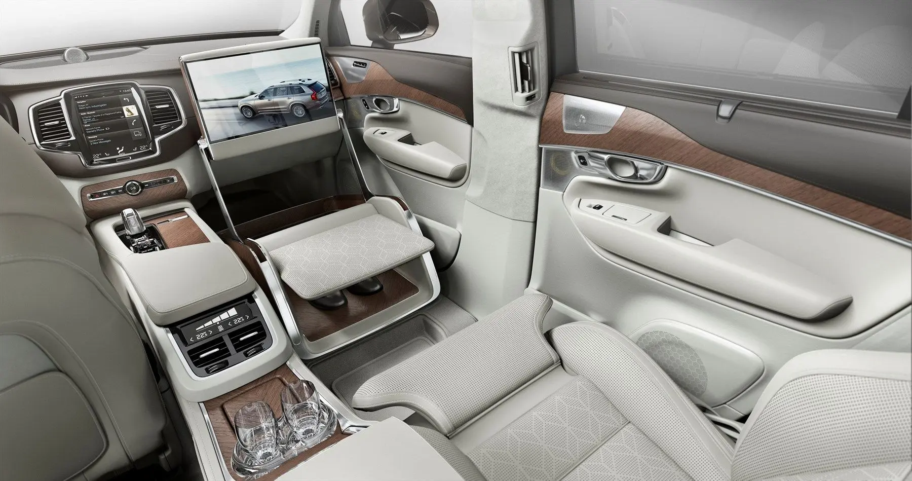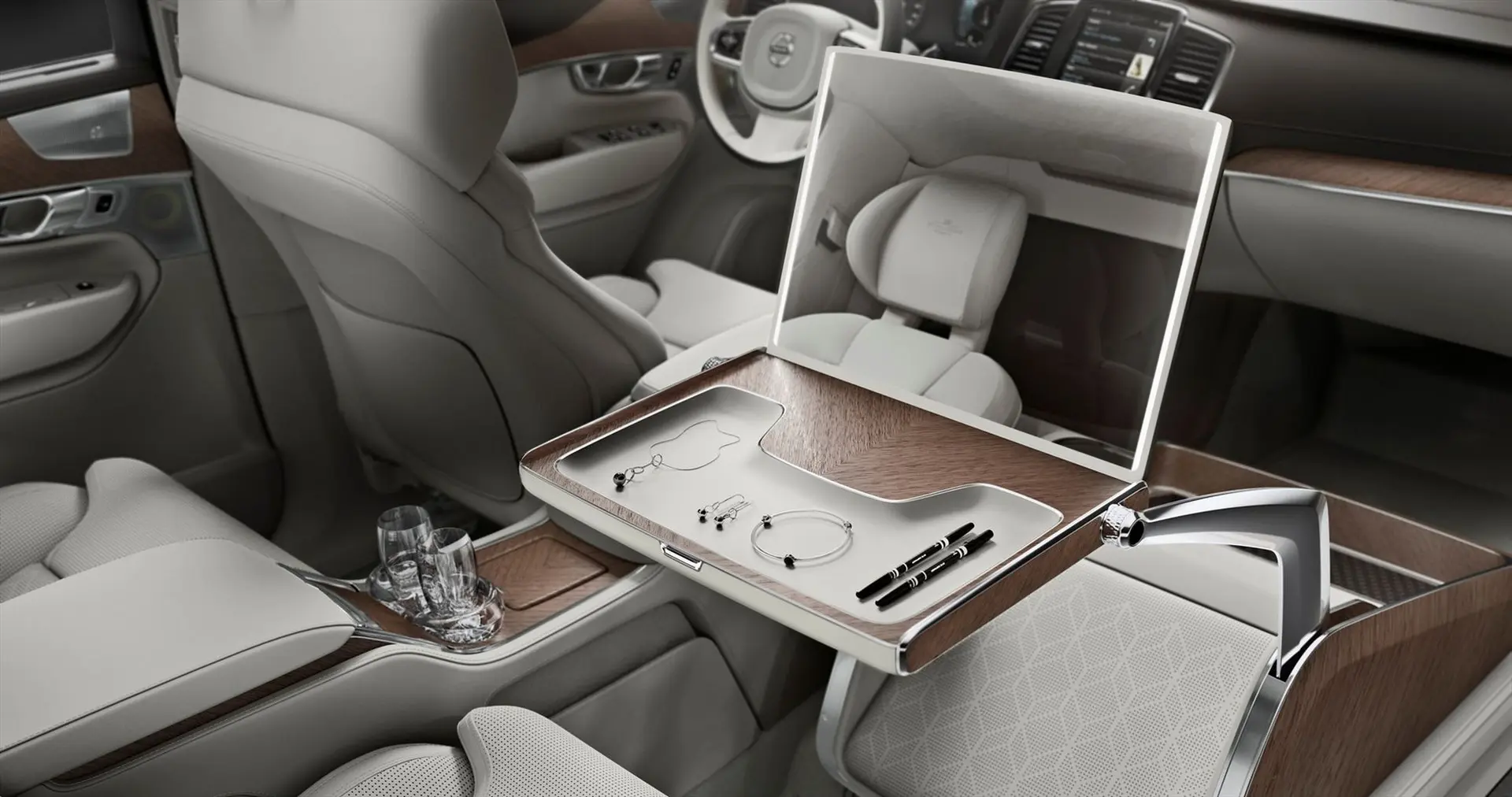 The Lounge Console incorporates features designed toenhance the in-car experience. Volvo Cars’ designers provide a large work table which opens to reveal an illuminated vanity mirror, including a storage tray for jewellery and personal accessories or make-up. The table rotates 90 degrees and simultaneously powers forward to display a large 17″ media screen for a full in-car theatre.